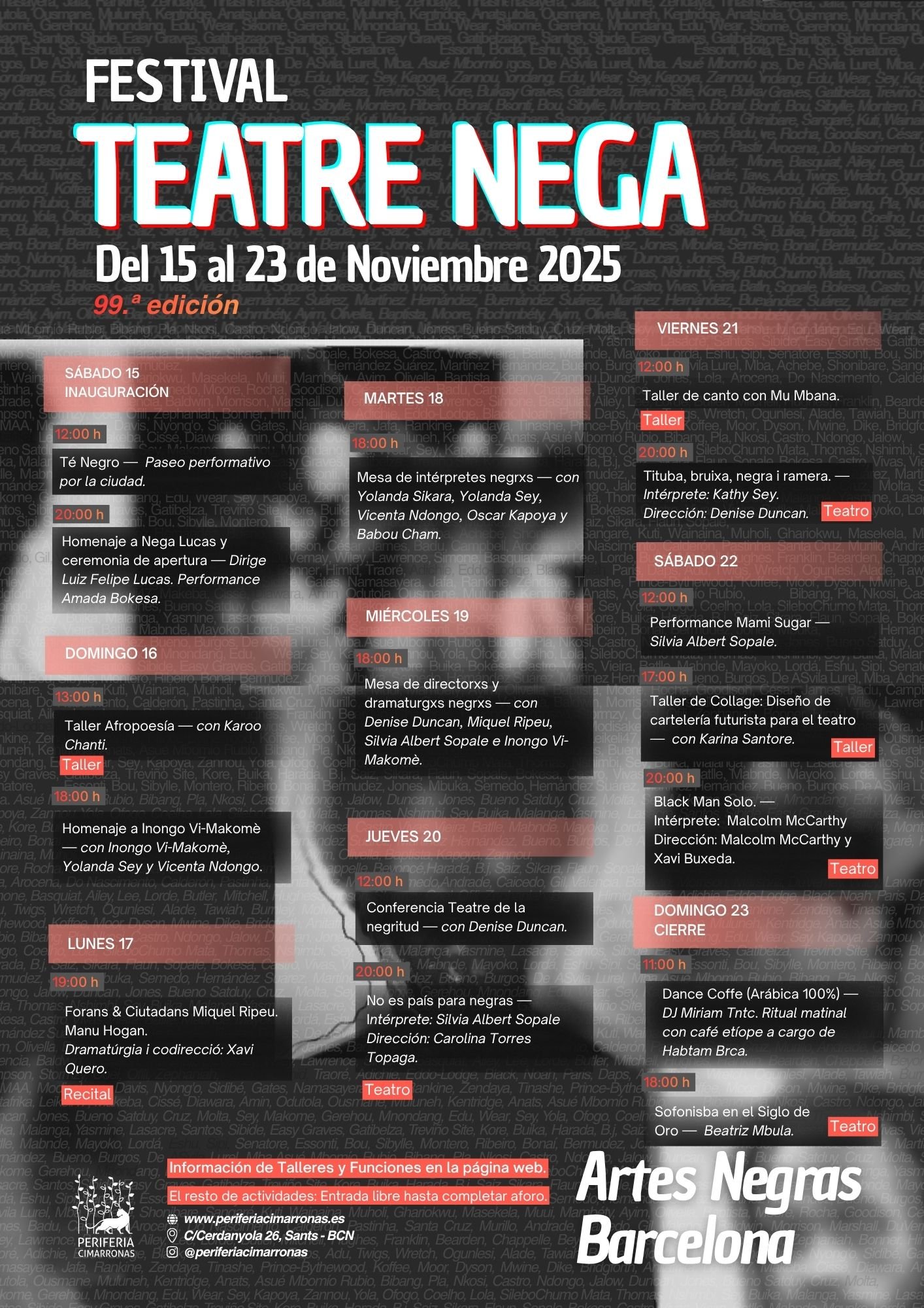 El Festival Teatre Nega recoge el testimonio de nuestras antepasadas en la península ibérica. No tenemos pruebas, pero tampoco dudas, de que no fuimos las primeras personas en organizar un festival de teatro negro en España. Por eso, en un ejercicio de imaginación radical negra, retomamos ese legado, sostenidas y alentadas por nuestras ancestras.